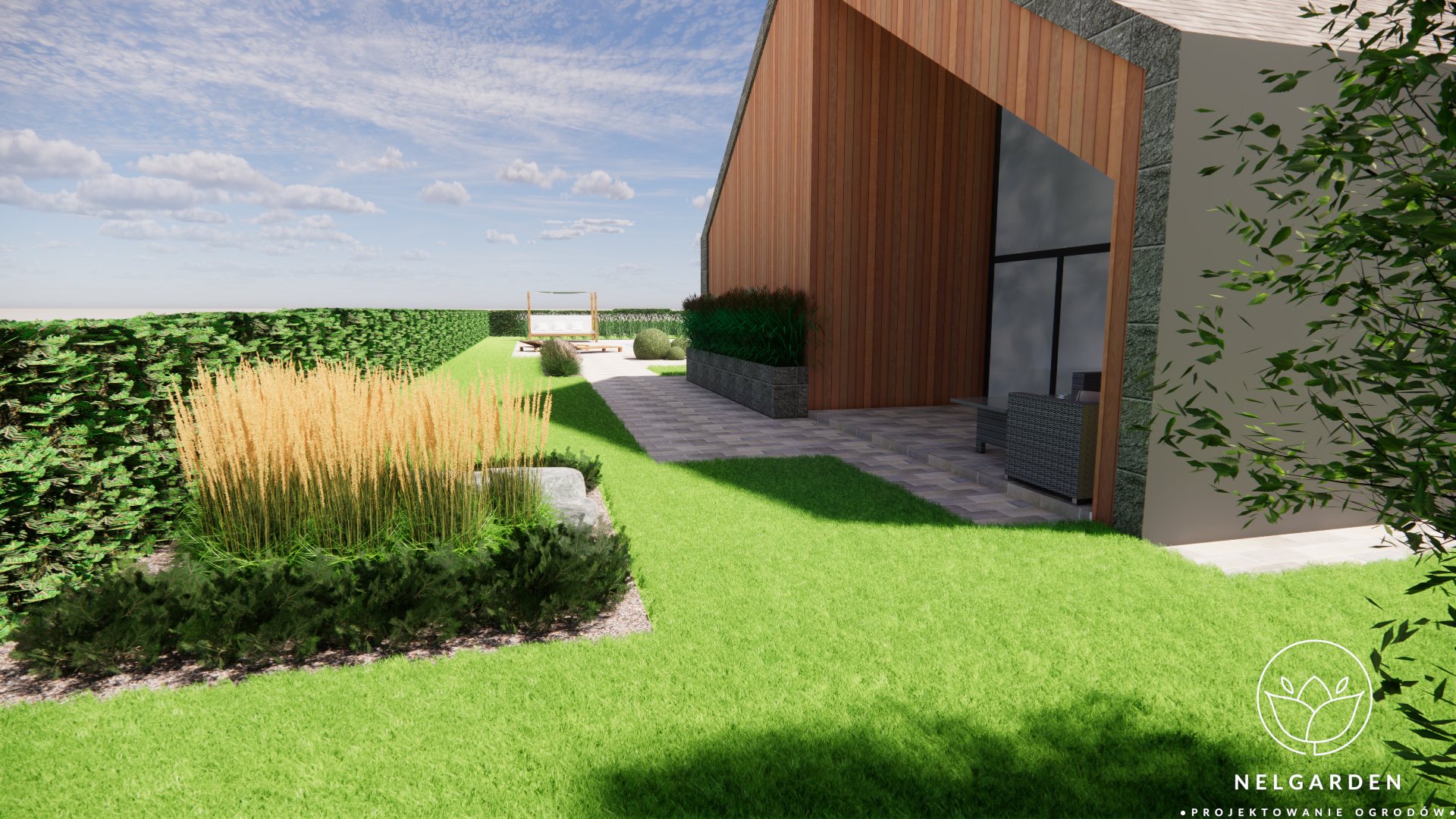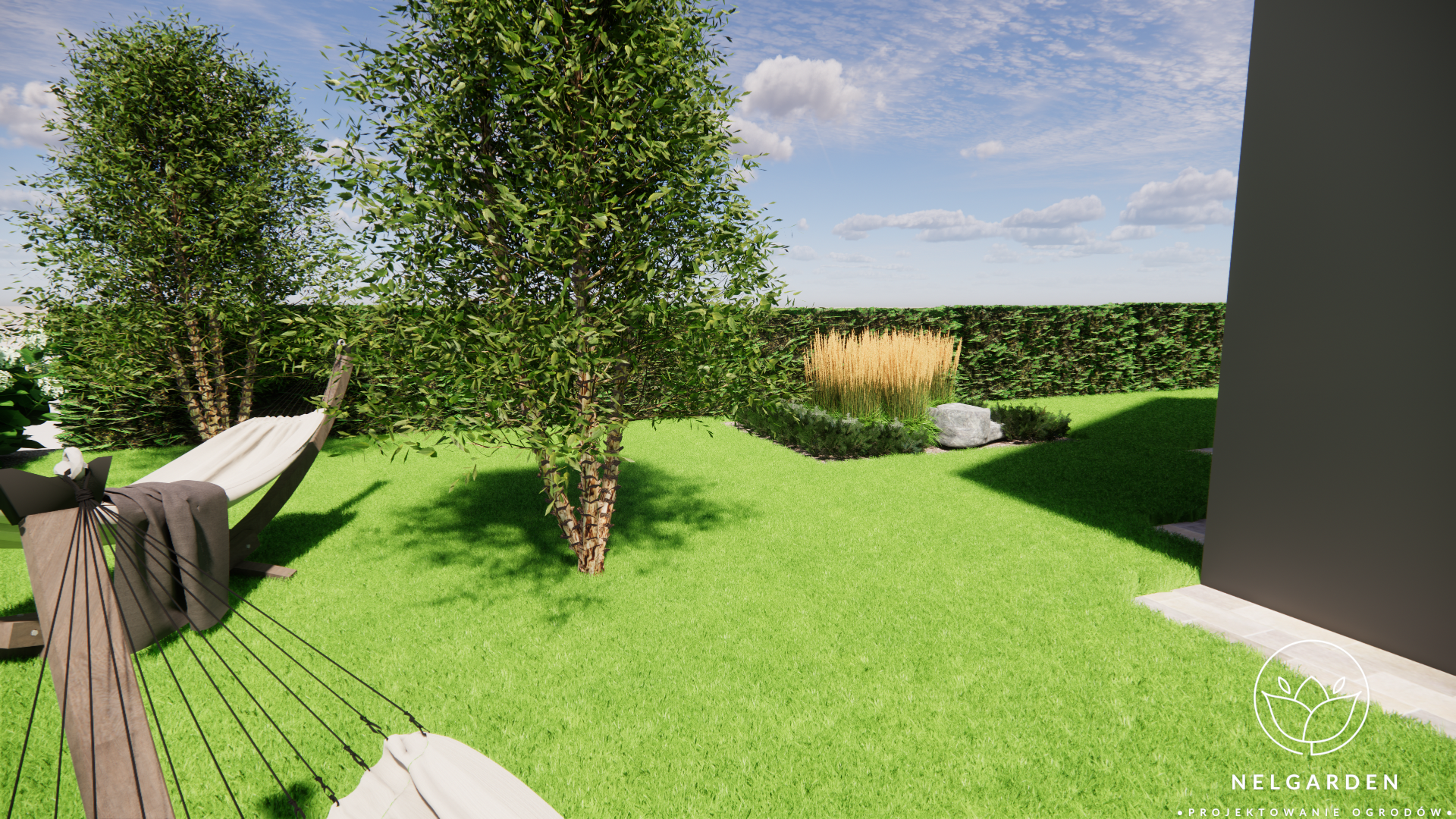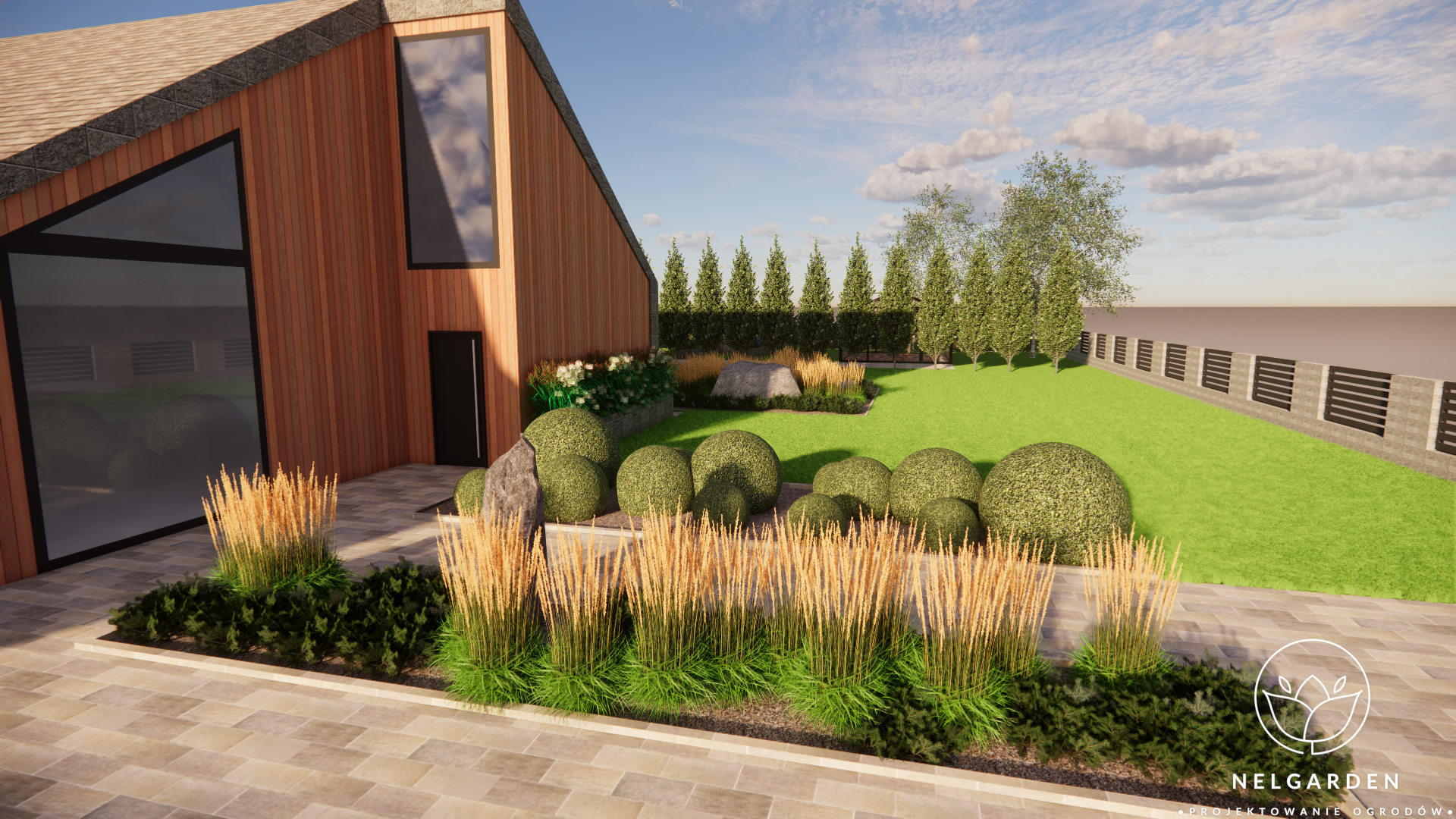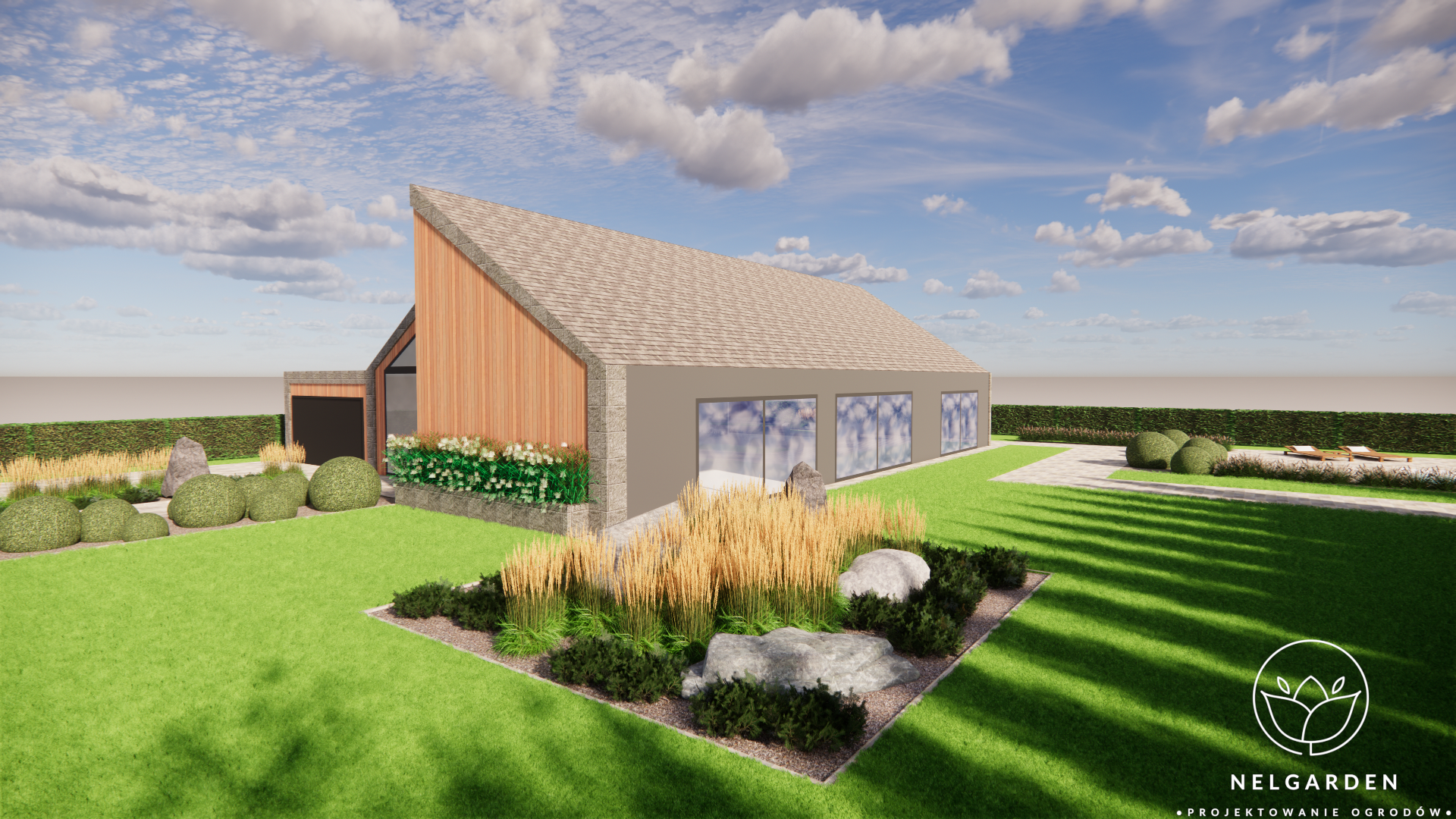 Ogród na rozległej działce w otoczeniu pól i lasu. Rabaty zostały zaplanowane w dwóch kontrastowych stylach: – naturalistyczny z traw ozdobnych i niskiej odmiany sosny, oraz nowoczesny, geometryczny z formowanych w kule cisów różnej wielkość. Z tyłu domu wygospodarowany został zaciszny kącik z brzozami i hamakami, wzdłuż ogrodzenia ciągnie się tam szpaler gęsto ukwieconych hortensji. Część basenowa obsadzona została szpalerami traw ozdobnych różnej wysokości. W bocznej części posesji miejsce znalazła stylowa szklarnia oraz wniesione donice na zioła i warzywa, oddzielone od reszty ogrodu szpalerem grabów. Wszystkie nasadzenia współgrają z bardzo nowoczesną bryłą domu.