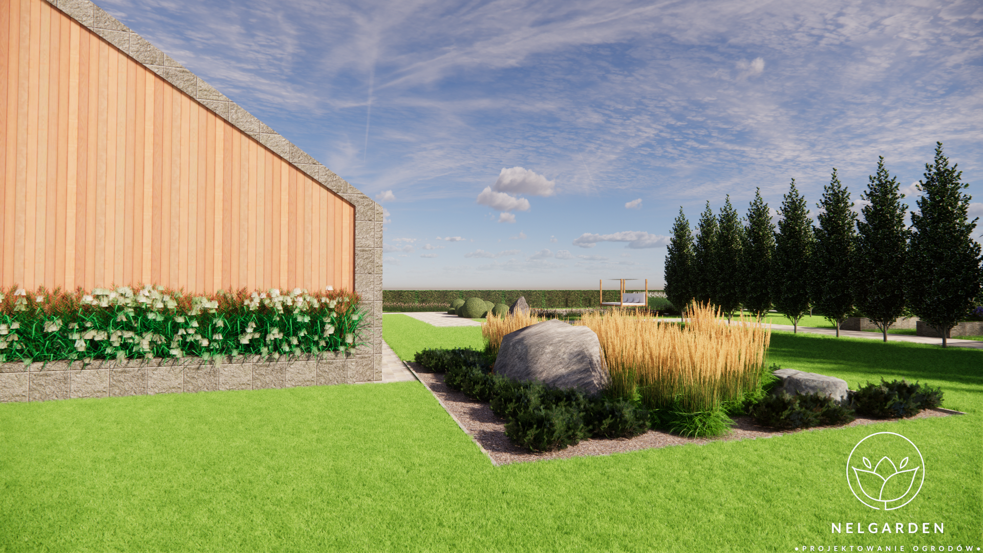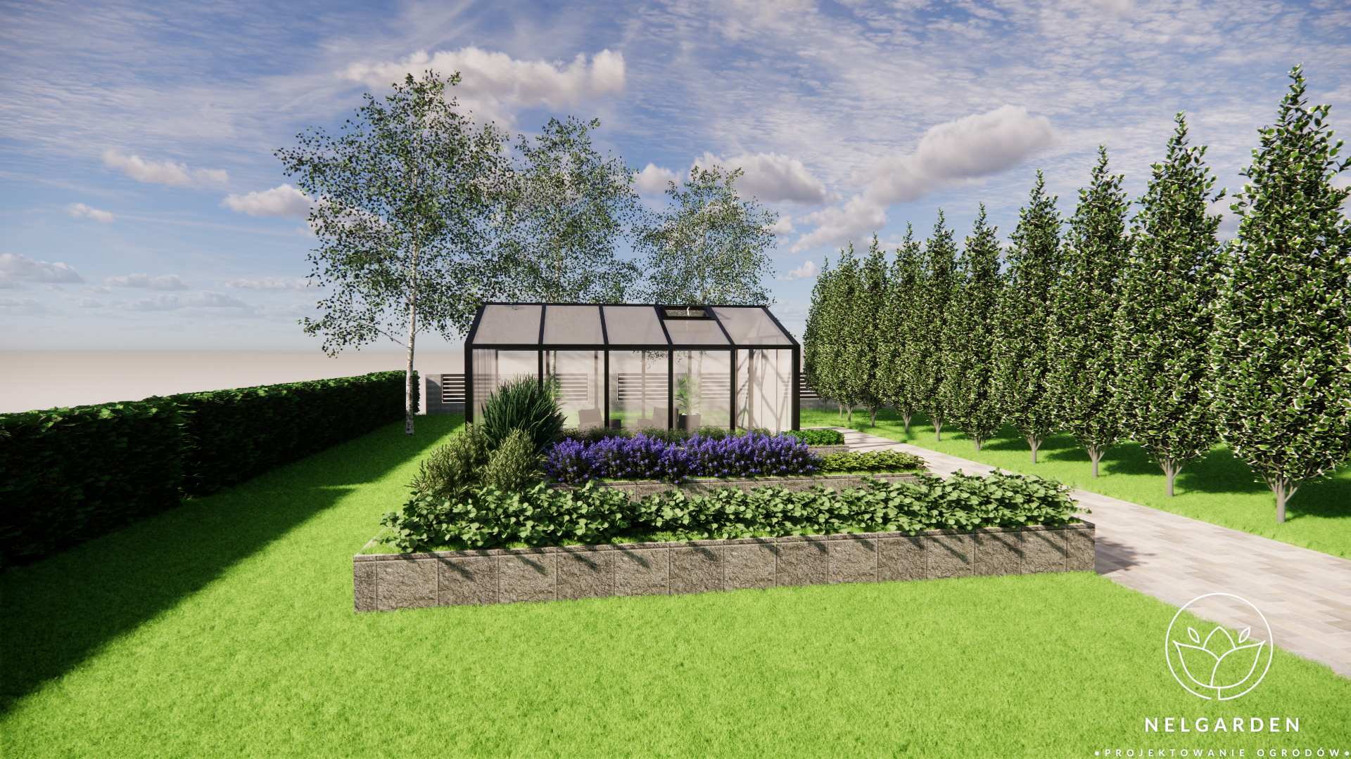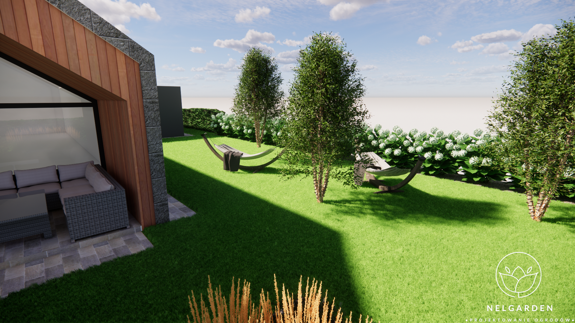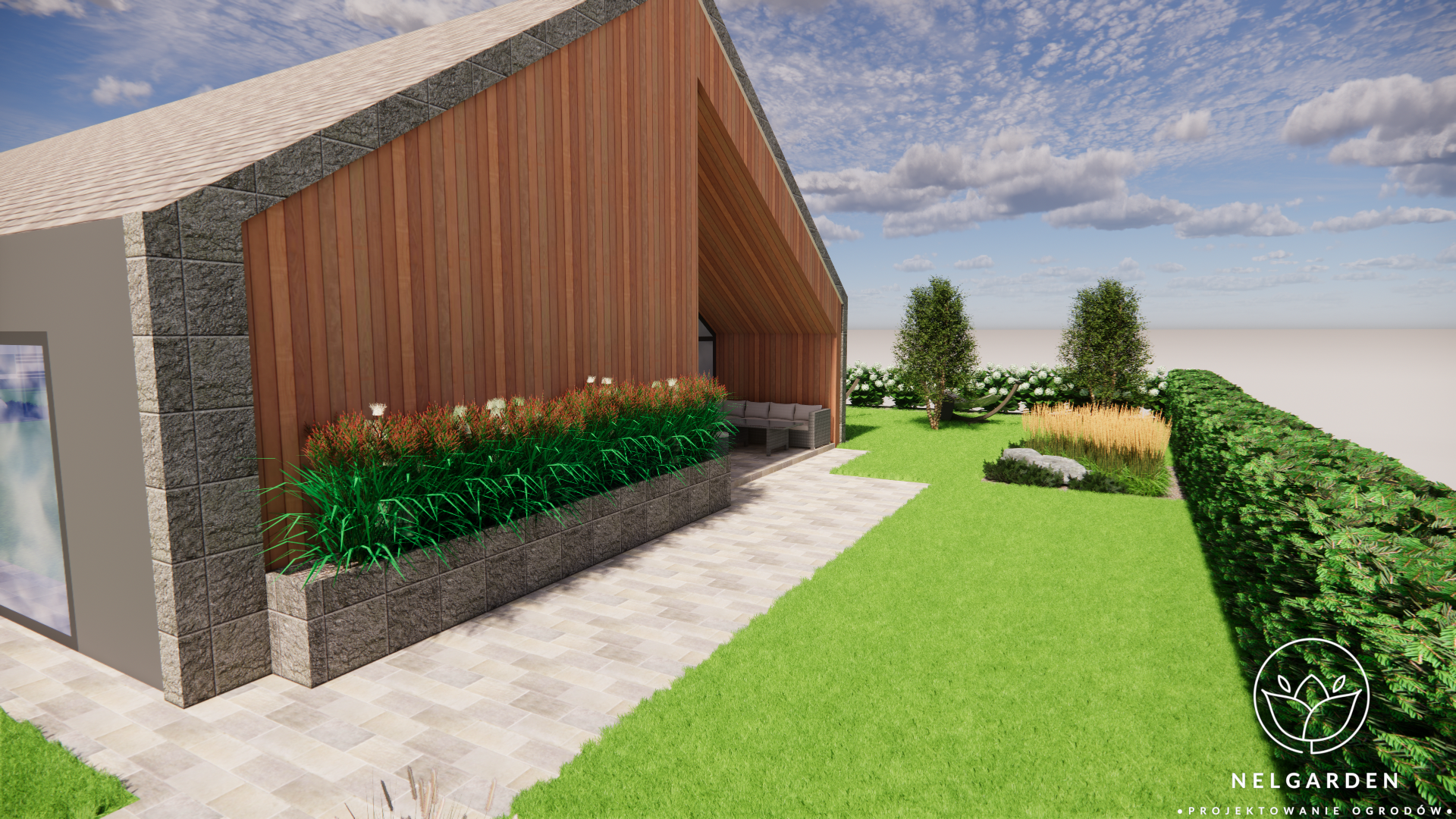 Ogród na rozległej działce w otoczeniu pól i lasu. Rabaty zostały zaplanowane w dwóch kontrastowych stylach: – naturalistyczny z traw ozdobnych i niskiej odmiany sosny, oraz nowoczesny, geometryczny z formowanych w kule cisów różnej wielkość. Z tyłu domu wygospodarowany został zaciszny kącik z brzozami i hamakami, wzdłuż ogrodzenia ciągnie się tam szpaler gęsto ukwieconych hortensji. Część basenowa obsadzona została szpalerami traw ozdobnych różnej wysokości. W bocznej części posesji miejsce znalazła stylowa szklarnia oraz wniesione donice na zioła i warzywa, oddzielone od reszty ogrodu szpalerem grabów. Wszystkie nasadzenia współgrają z bardzo nowoczesną bryłą domu.