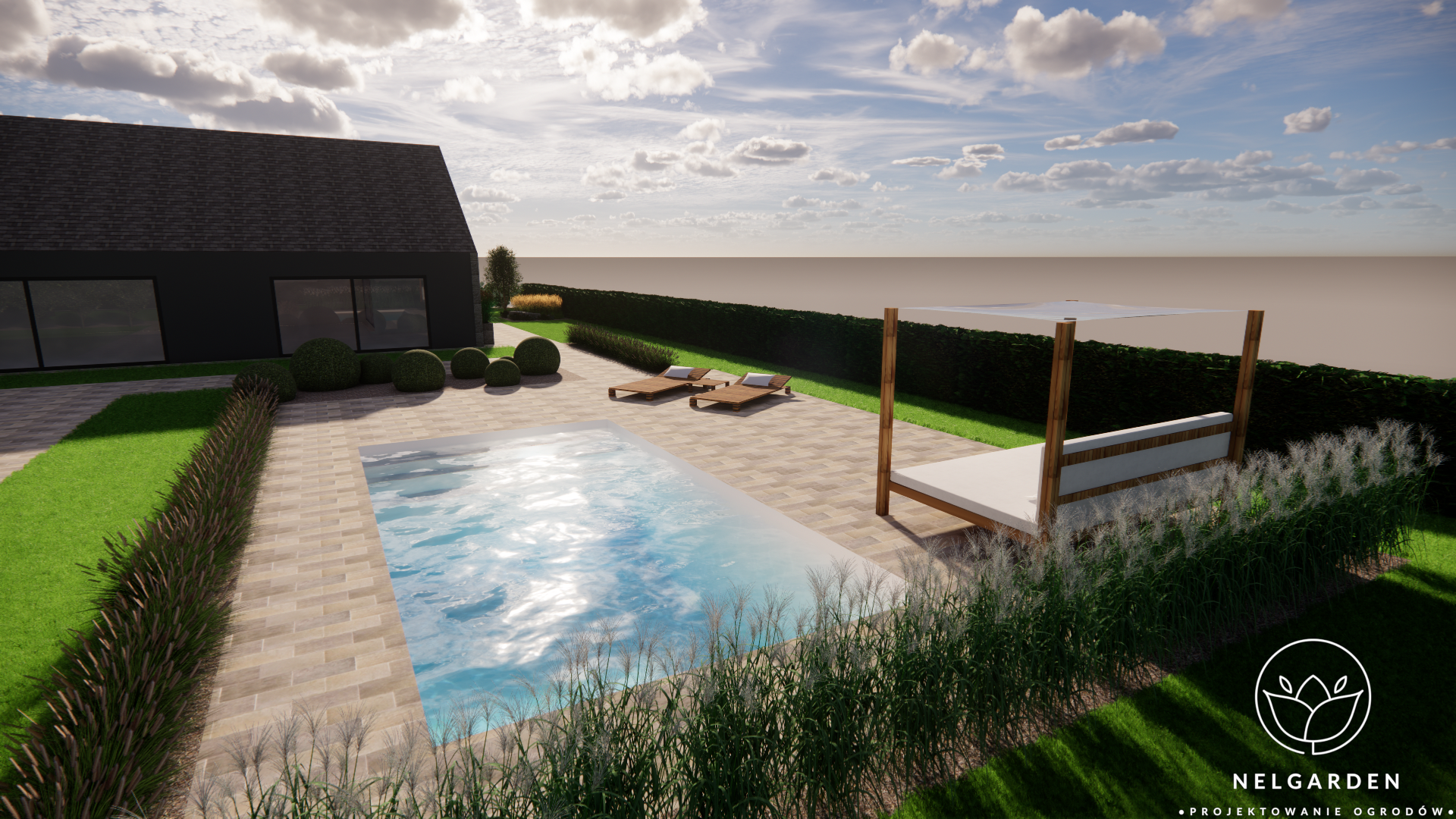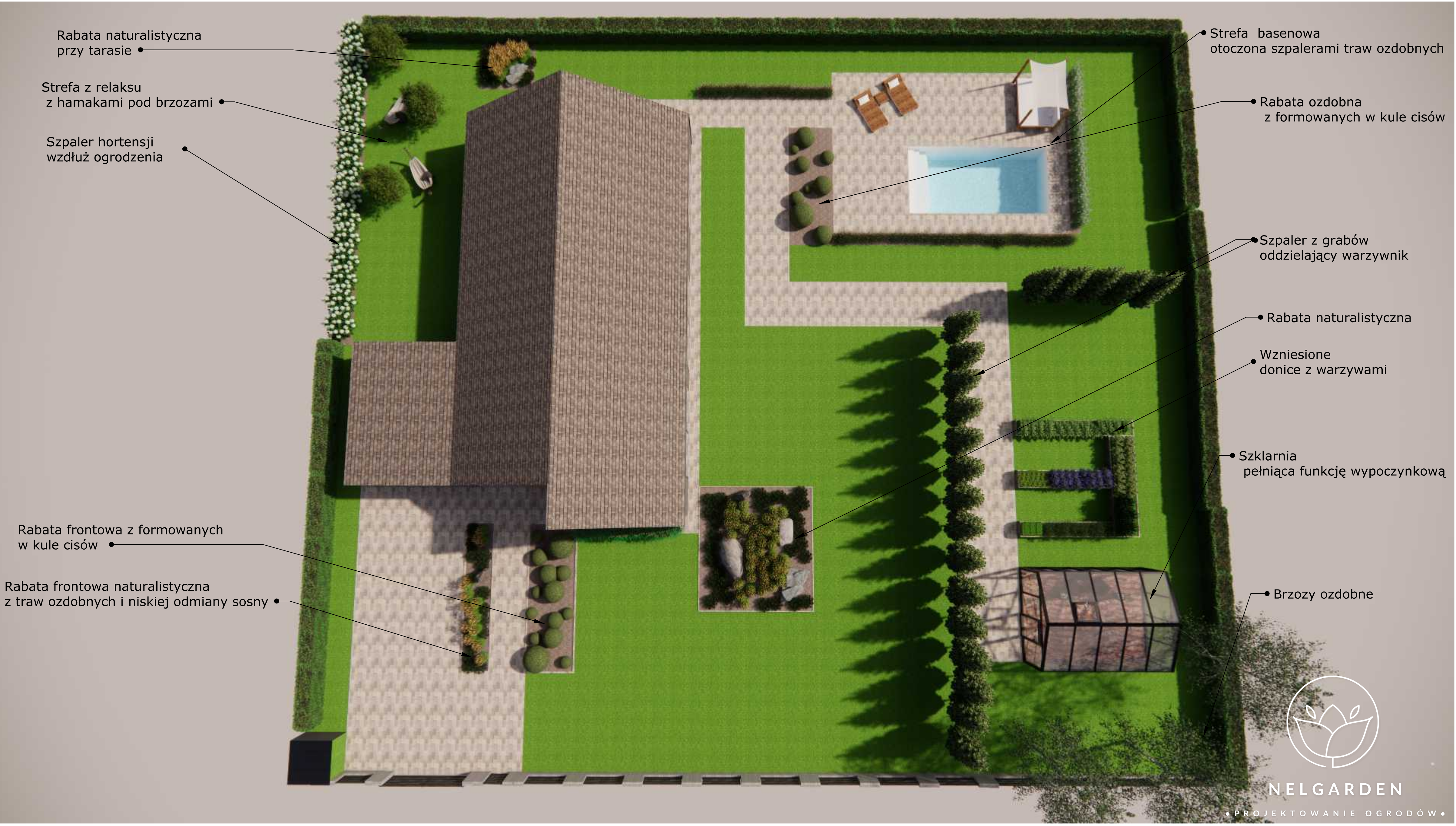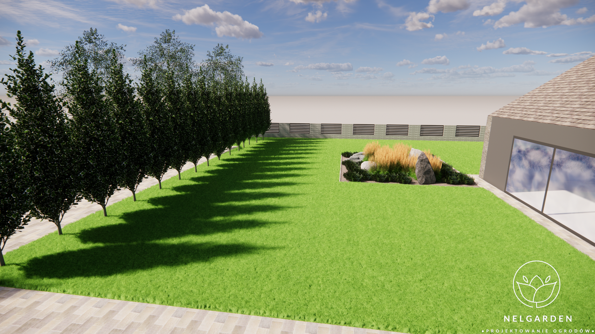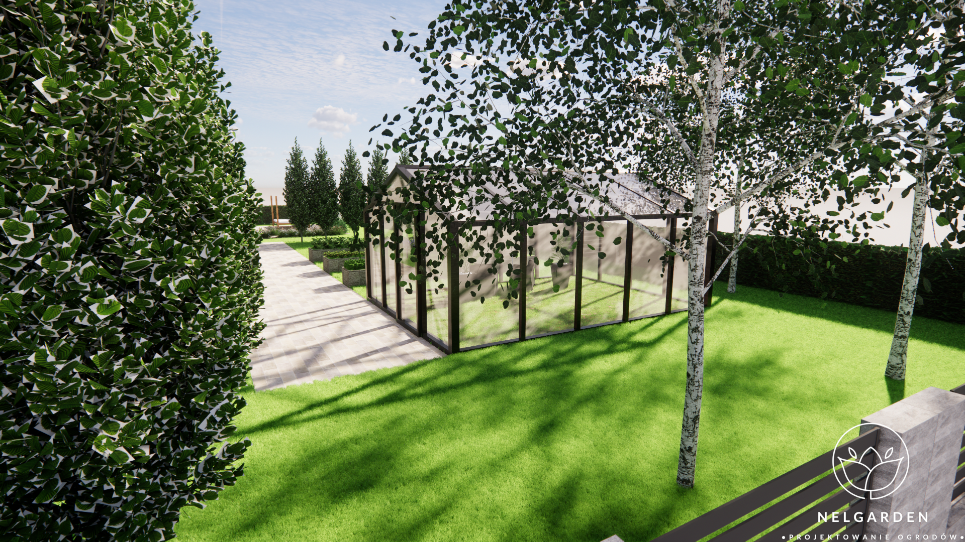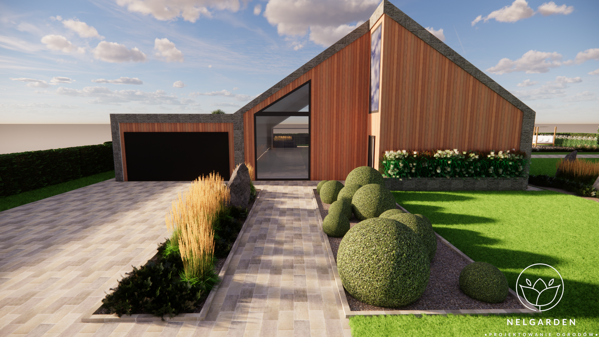 Ogród na rozległej działce w otoczeniu pól i lasu. Rabaty zostały zaplanowane w dwóch kontrastowych stylach: – naturalistyczny z traw ozdobnych i niskiej odmiany sosny, oraz nowoczesny, geometryczny z formowanych w kule cisów różnej wielkość. Z tyłu domu wygospodarowany został zaciszny kącik z brzozami i hamakami, wzdłuż ogrodzenia ciągnie się tam szpaler gęsto ukwieconych hortensji. Część basenowa obsadzona została szpalerami traw ozdobnych różnej wysokości. W bocznej części posesji miejsce znalazła stylowa szklarnia oraz wniesione donice na zioła i warzywa, oddzielone od reszty ogrodu szpalerem grabów. Wszystkie nasadzenia współgrają z bardzo nowoczesną bryłą domu.