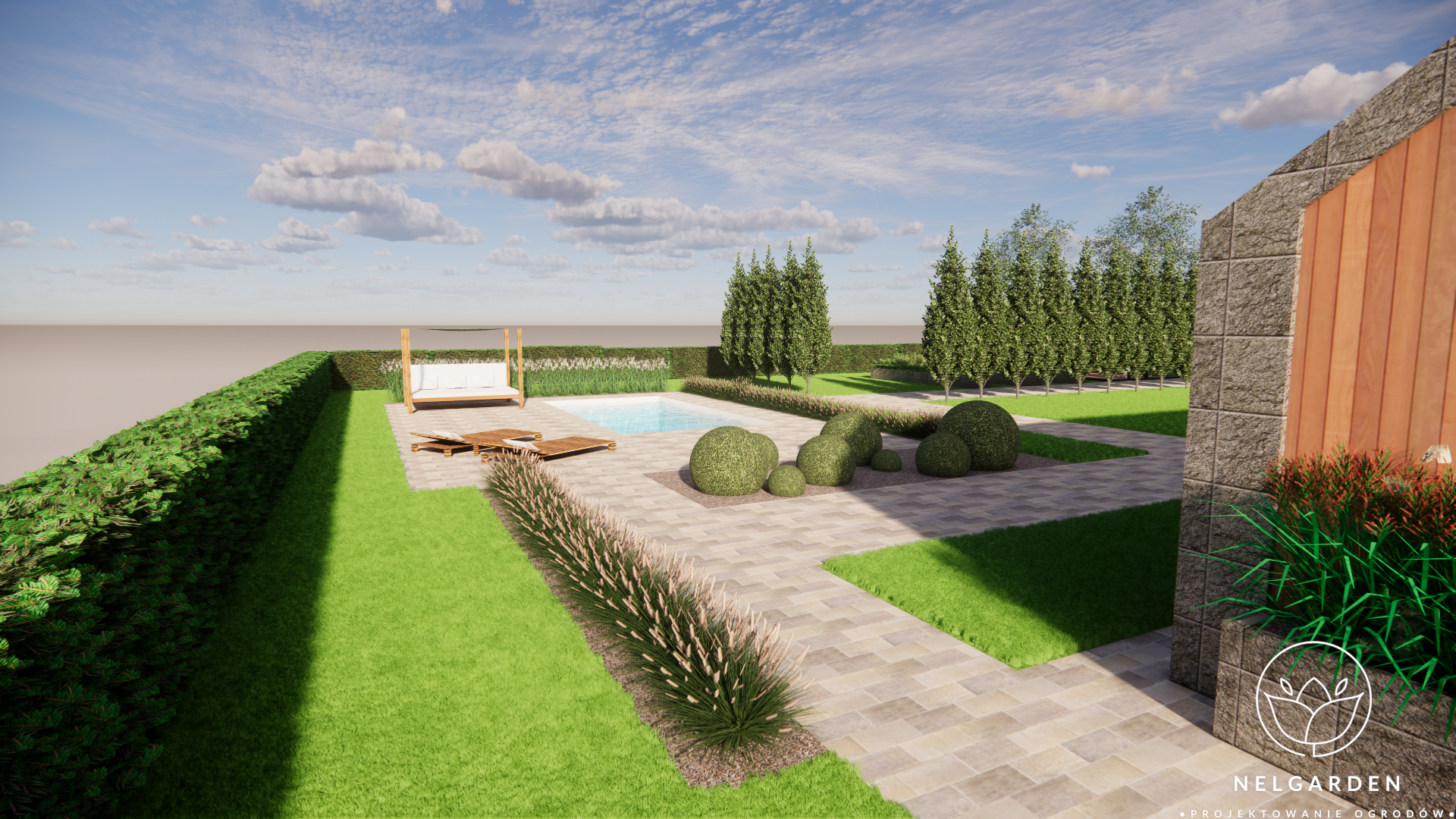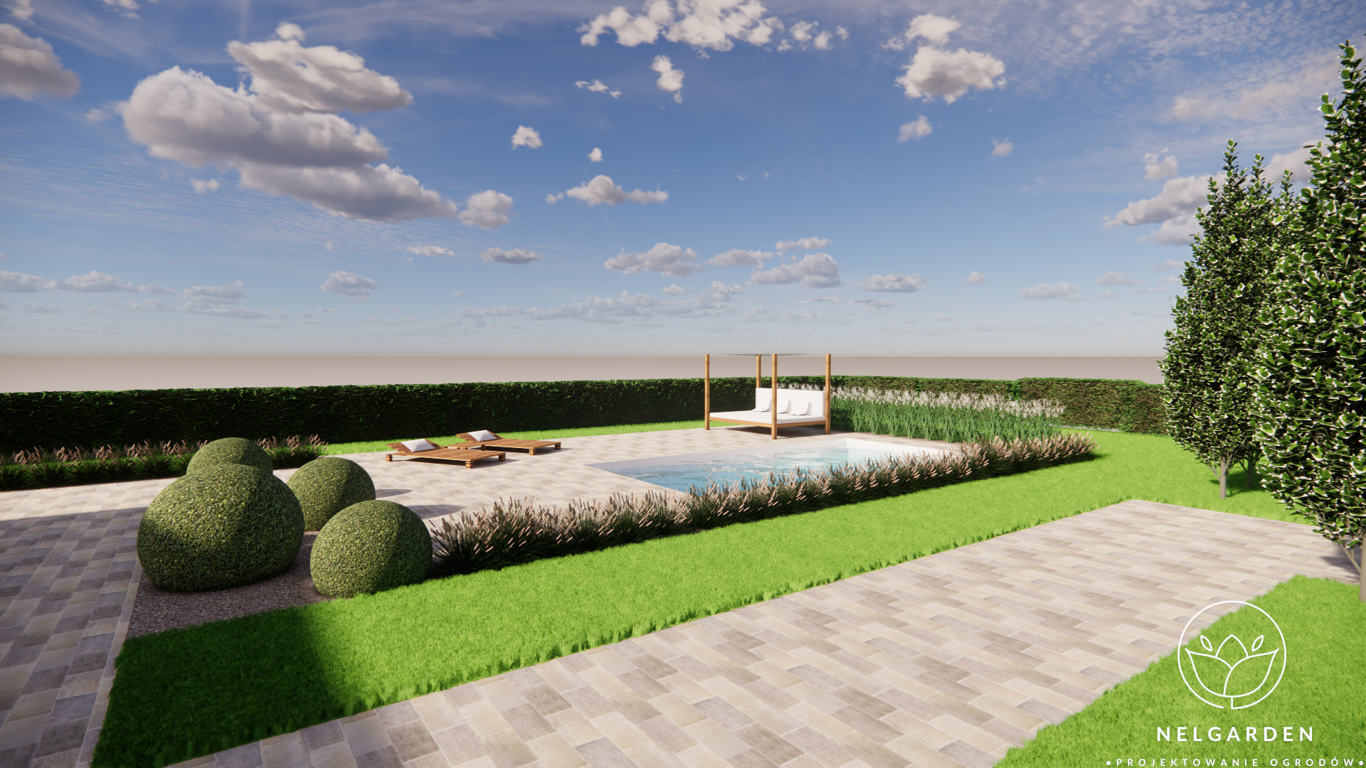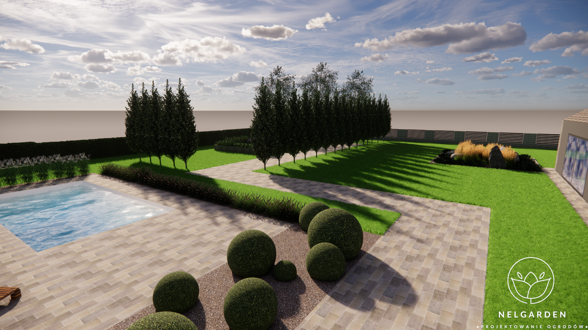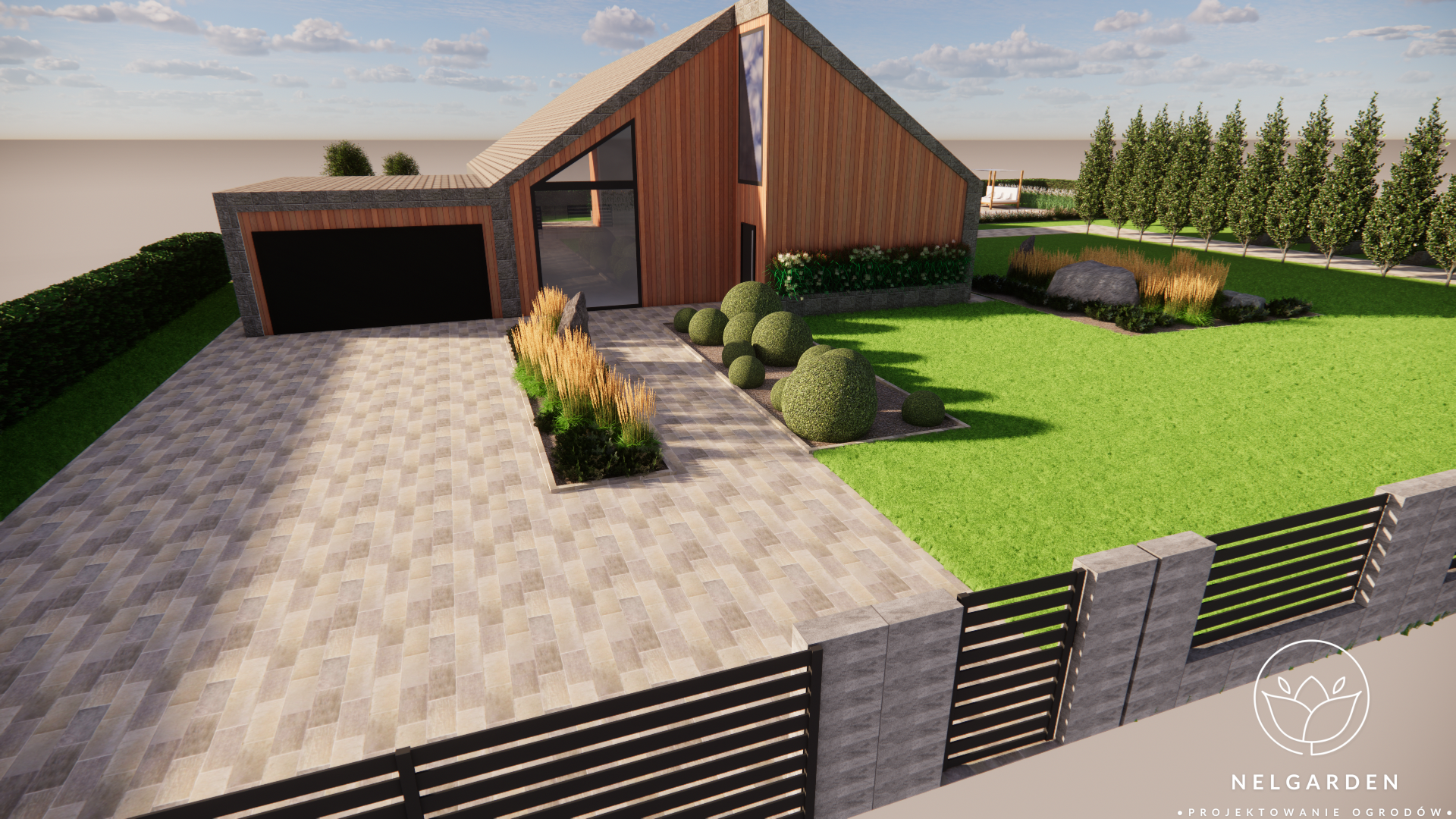 Ogród na rozległej działce w otoczeniu pól i lasu. Rabaty zostały zaplanowane w dwóch kontrastowych stylach: – naturalistyczny z traw ozdobnych i niskiej odmiany sosny, oraz nowoczesny, geometryczny z formowanych w kule cisów różnej wielkość. Z tyłu domu wygospodarowany został zaciszny kącik z brzozami i hamakami, wzdłuż ogrodzenia ciągnie się tam szpaler gęsto ukwieconych hortensji. Część basenowa obsadzona została szpalerami traw ozdobnych różnej wysokości. W bocznej części posesji miejsce znalazła stylowa szklarnia oraz wniesione donice na zioła i warzywa, oddzielone od reszty ogrodu szpalerem grabów. Wszystkie nasadzenia współgrają z bardzo nowoczesną bryłą domu.