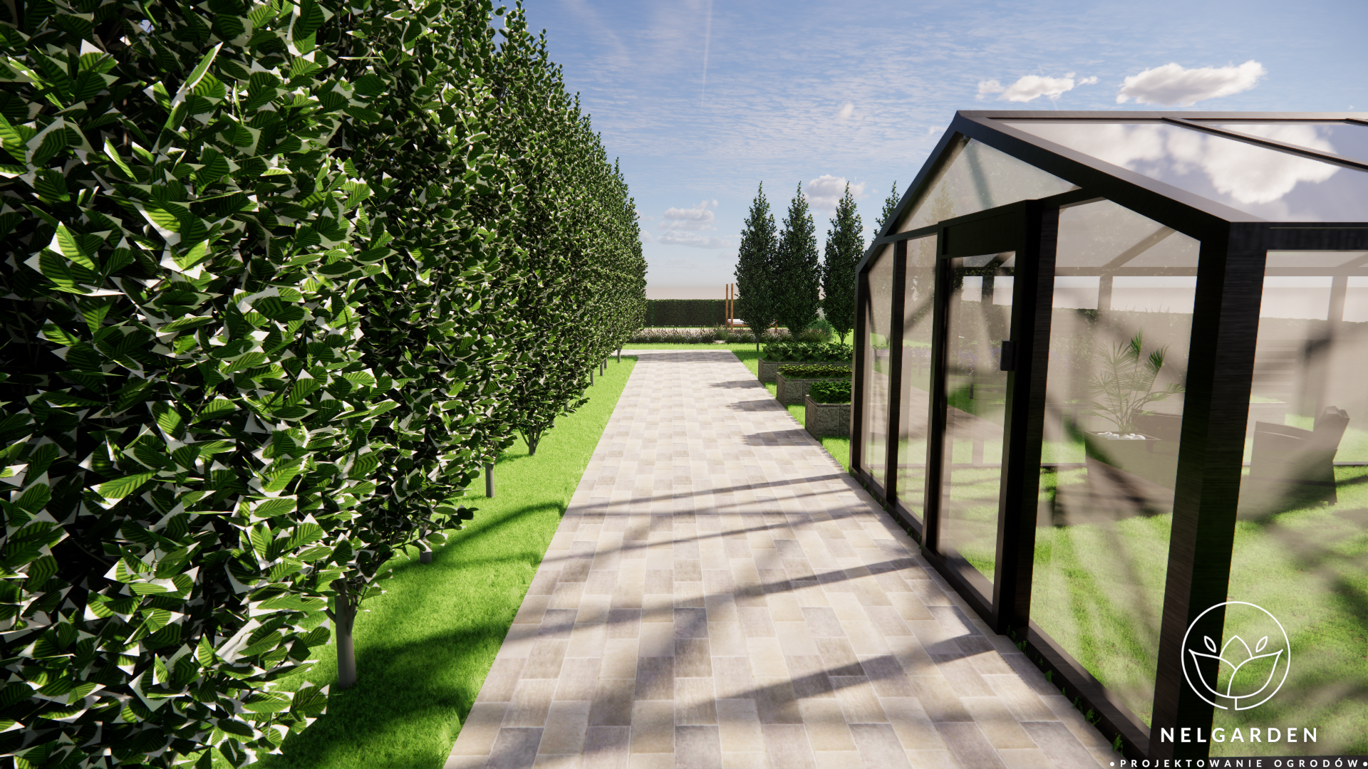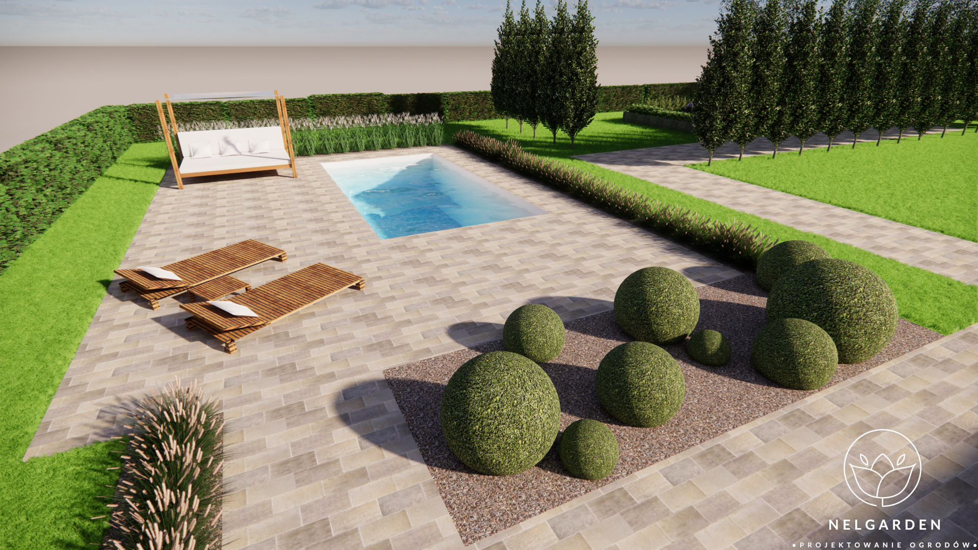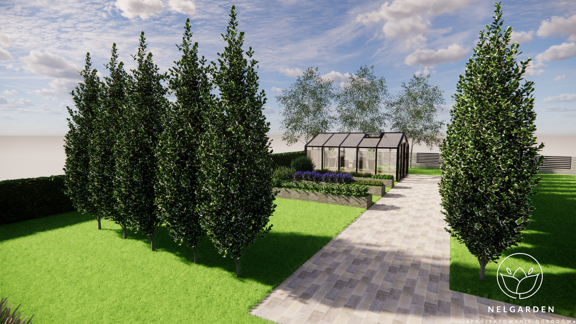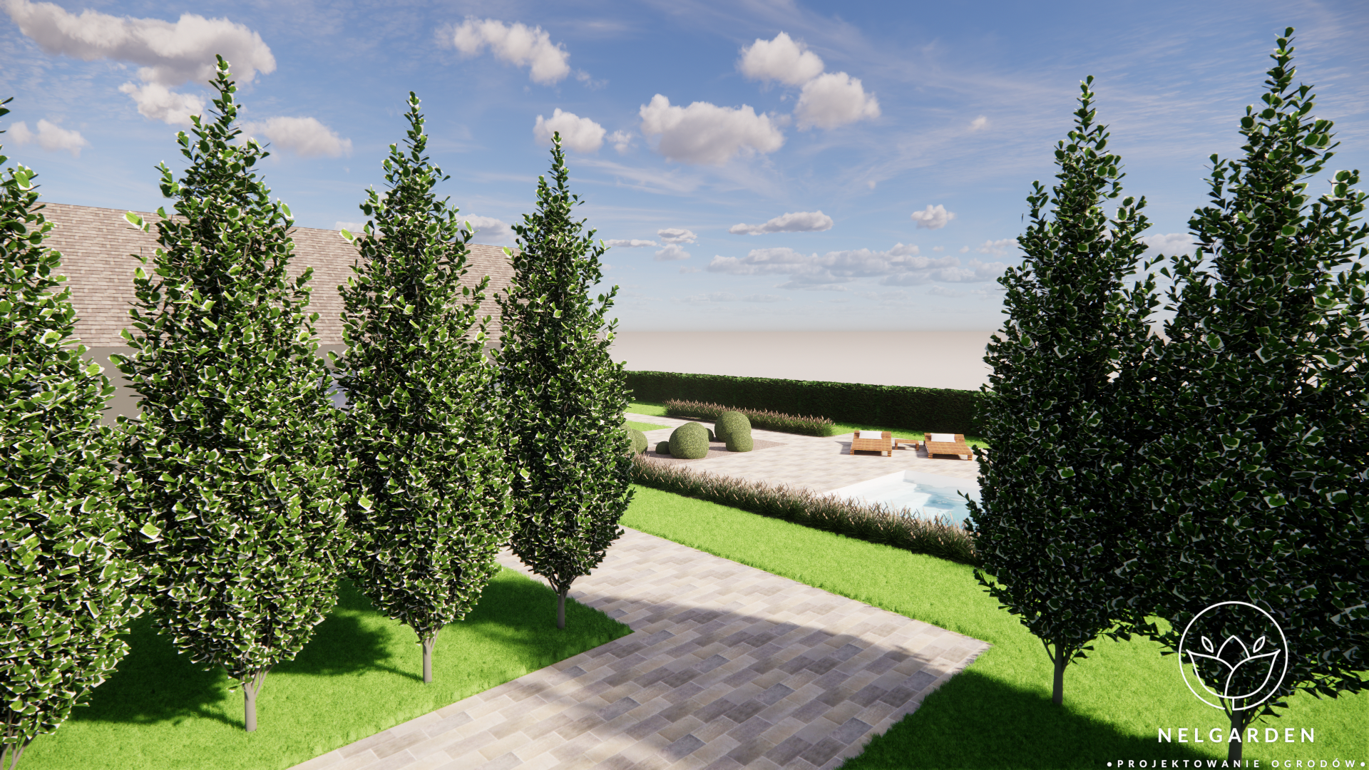 Ogród na rozległej działce w otoczeniu pól i lasu. Rabaty zostały zaplanowane w dwóch kontrastowych stylach: – naturalistyczny z traw ozdobnych i niskiej odmiany sosny, oraz nowoczesny, geometryczny z formowanych w kule cisów różnej wielkość. Z tyłu domu wygospodarowany został zaciszny kącik z brzozami i hamakami, wzdłuż ogrodzenia ciągnie się tam szpaler gęsto ukwieconych hortensji. Część basenowa obsadzona została szpalerami traw ozdobnych różnej wysokości. W bocznej części posesji miejsce znalazła stylowa szklarnia oraz wniesione donice na zioła i warzywa, oddzielone od reszty ogrodu szpalerem grabów. Wszystkie nasadzenia współgrają z bardzo nowoczesną bryłą domu.