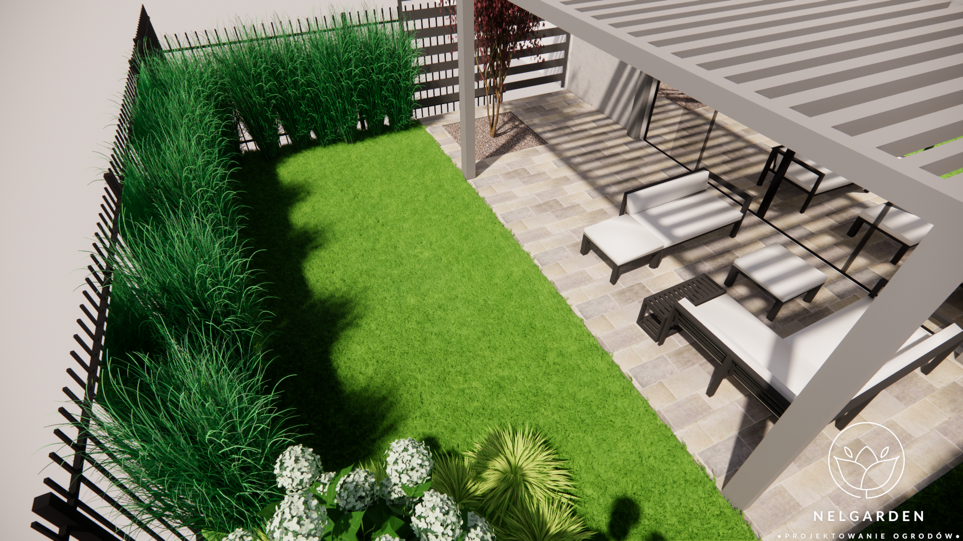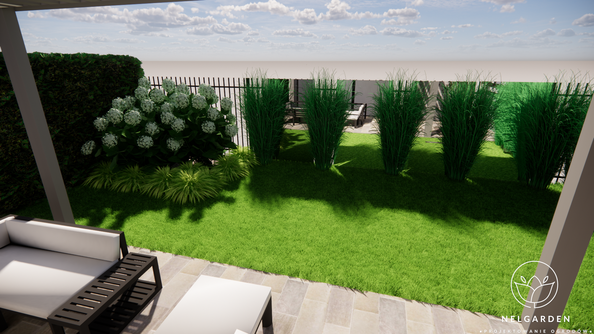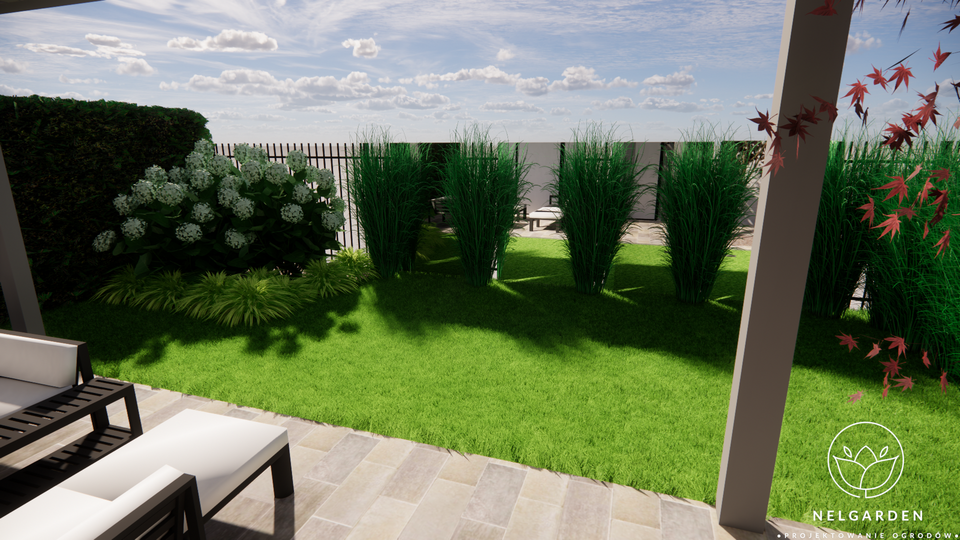 Niewielki ogród przy domu w zabudowie szeregowej. Głównym akcentem dekoracyjnym ogrodu jest ozdobne drzewo – klon z efektowna koroną, osadzone w tarasie z kostki brukowej. Na niewielkim trawniku, w rogu działki zaplanowana została rabata z krzewami hortensji i trawami zimozielonymi. Wzdłuż ogrodzenia, obsadzone wysokimi trawami, osadzone zostały lustra zewnętrzne, optycznie powiększające przestrzeń. Całość w eleganckim, minimalistycznym stylu.
