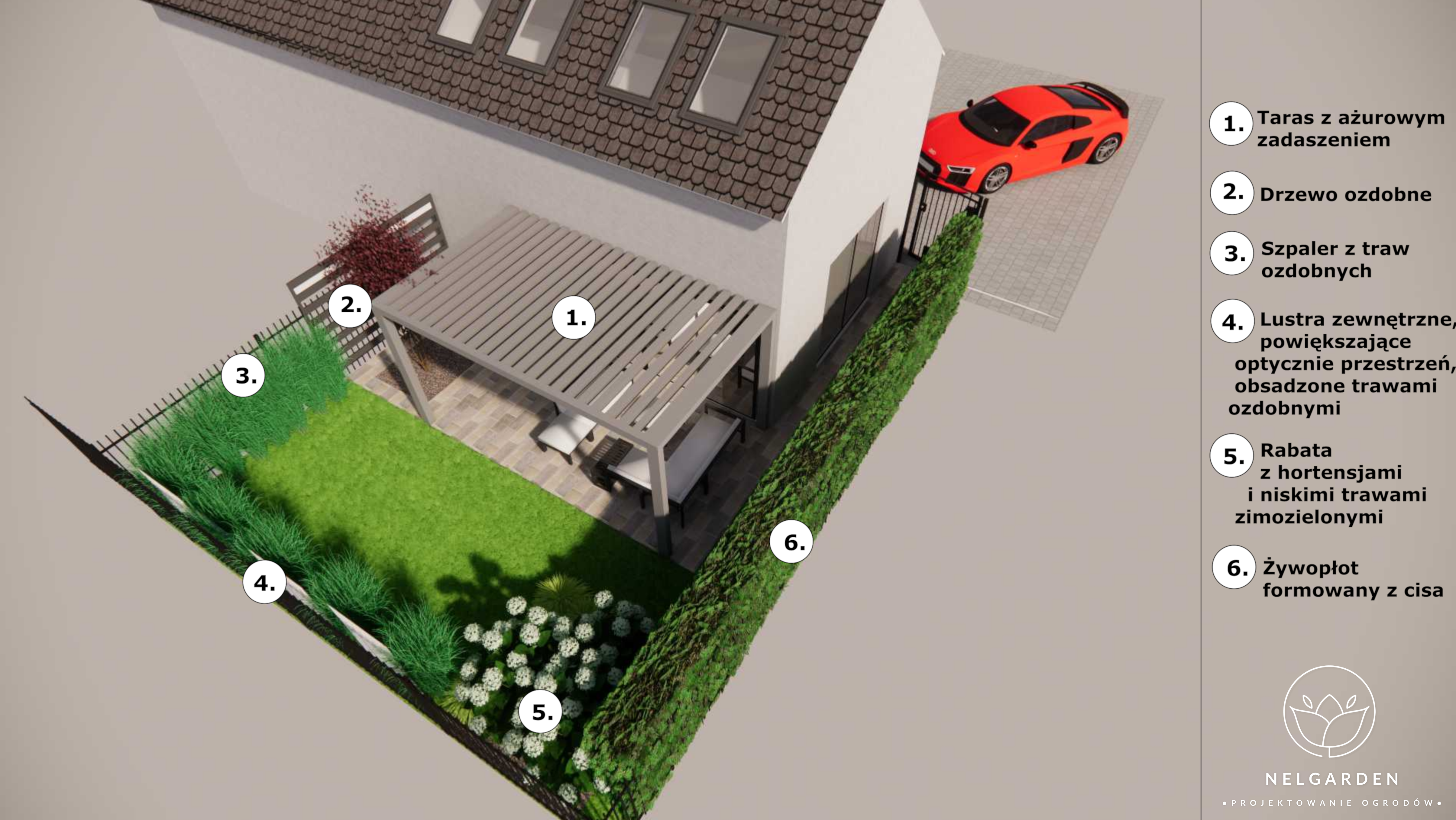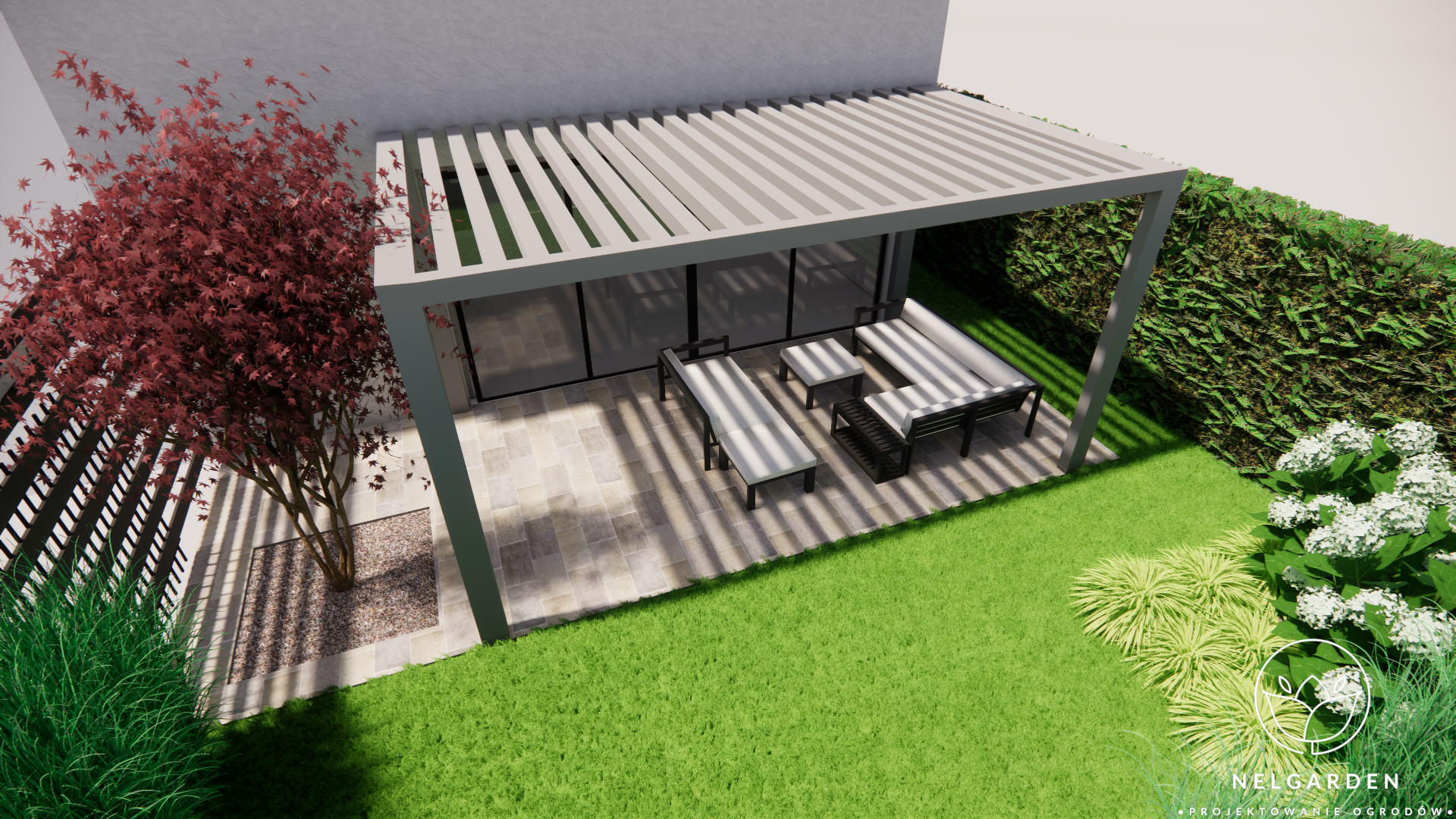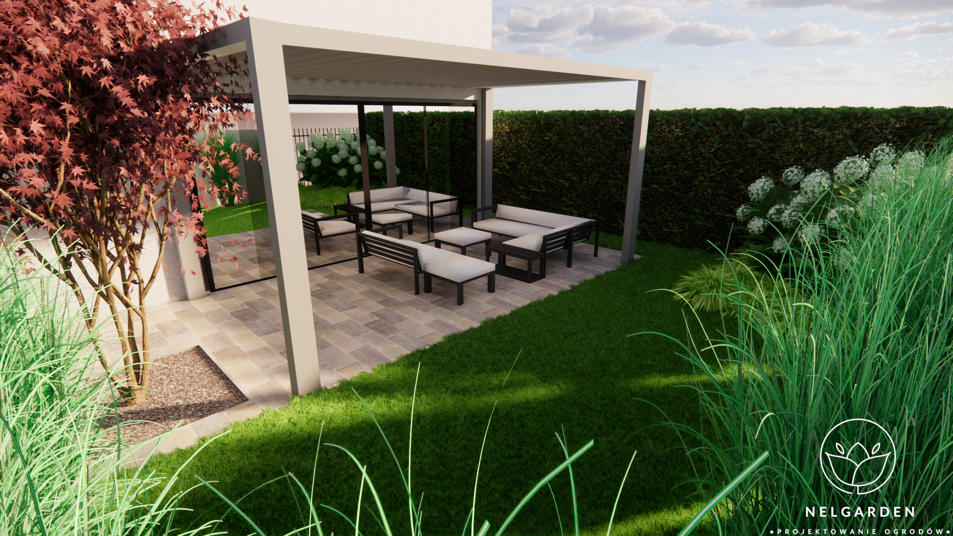 Niewielki ogród przy domu w zabudowie szeregowej. Głównym akcentem dekoracyjnym ogrodu jest ozdobne drzewo – klon z efektowna koroną, osadzone w tarasie z kostki brukowej. Na niewielkim trawniku, w rogu działki zaplanowana została rabata z krzewami hortensji i trawami zimozielonymi. Wzdłuż ogrodzenia, obsadzone wysokimi trawami, osadzone zostały lustra zewnętrzne, optycznie powiększające przestrzeń. Całość w eleganckim, minimalistycznym stylu.
